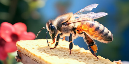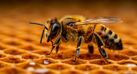 In a warm, golden glow, a diligent honey bee takes a moment to sip sweet, glistening nectar directly from the honeycomb. This macro photograph captures the intricate details of the bee and the rich, liquid gold it produces, symbolizing hard work, natures sweetness, and the vital process of honey creation.