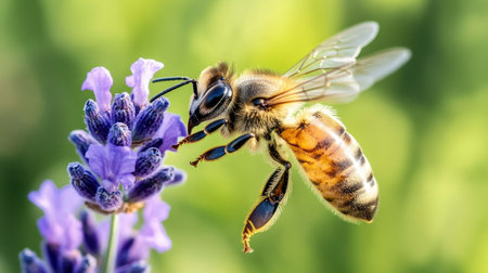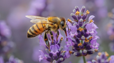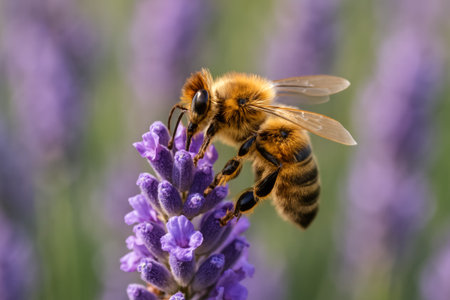 A diligent honey bee gathering vital nectar from a beautiful purple lavender flower