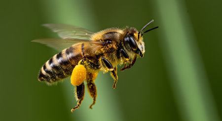 Busy Honey Bee in Flight with Full Pollen Sacs on a Blurry Green Background Macro Closeup of Apis Mellifera Pollinator
