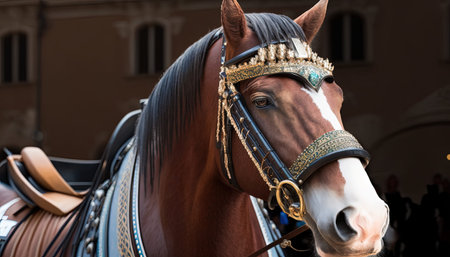 Thoroughbred stallion in bridle, focus on mane, outdoors on farm generated by artificial intelligence