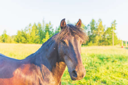 Brown horse posing on the green meadow summertime. Head shot closeup of a purebred young horse on summer pasture. Closeup of a young domestic horse on natural green background outdoors.
