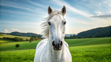 Portrait of closeup white arabian horse on beach in Hua Hin, Thailand.