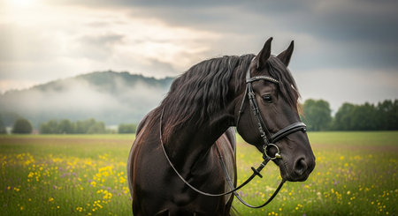 Beautiful black horse portrait in a field with yellow flowers at sunset
