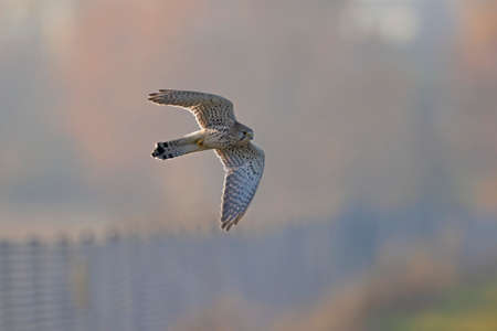 Common Kestrel (Falco tinnunculus) Male Bird Flying against Bright Background. Small Raptor in Extremadura, Spain. Wildlife Scene of Nature in Europe.