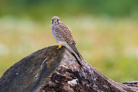 Close up of a common kestrel perched on a tree trunk against green background, United Kingdom.