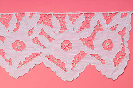 White lace on a pink background. Copy space. Top view.