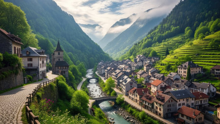 Urban city center on an alpine mountain majestic calm. Generative AI AIG18.