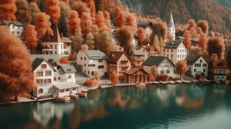 Beautiful nature of European Alps, landscape view of alpine mountains, lake and village in autumn season, travel and destination scenery