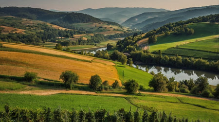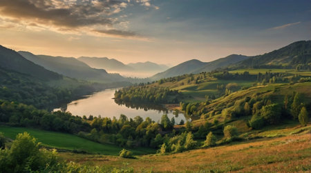 A body of water surrounded by trees and mountains. AI generative image.