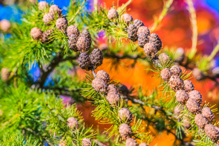 Yellow larch tree with small cone in autumn. Macro image, shallow depth of field. Nature background