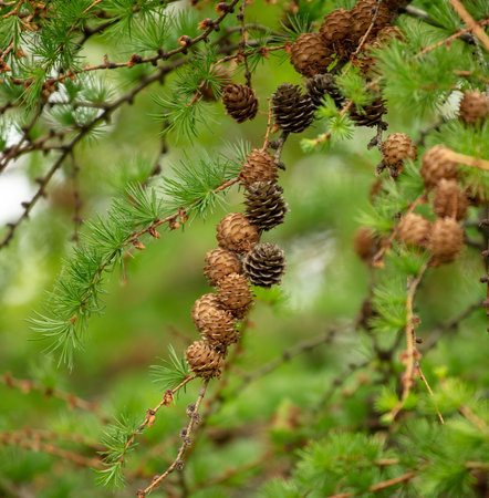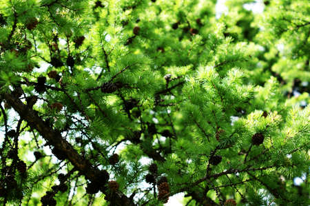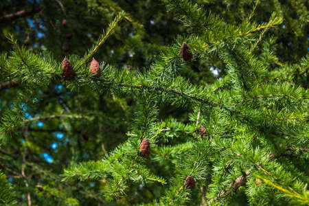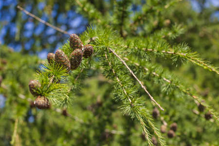 Bright green fluffy branches with cones of larch tree Larix decidua Pendula in summer day. Natural beauty of elegant larch tree twig. Close-up branch of young larch.