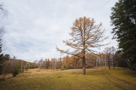 Larch tree landscape, Majestic larch standing tall in lush meadow scene with cloudy sky, Vivid portrait of larch tree in grassy clearing surrounded by mixed woods under overcast weather