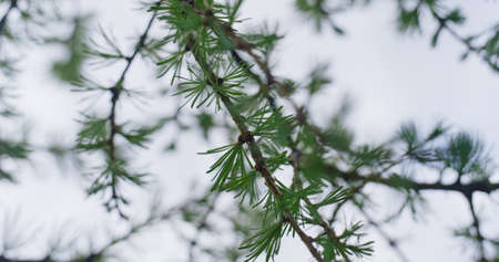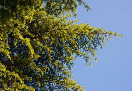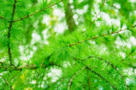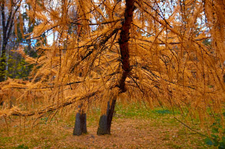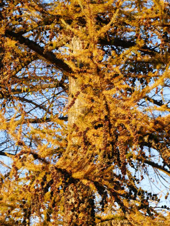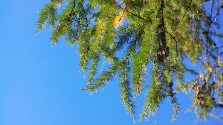 Bright fluffy branches of larix tree. Autumn sunny photo of larch tree. Fall sunny day.