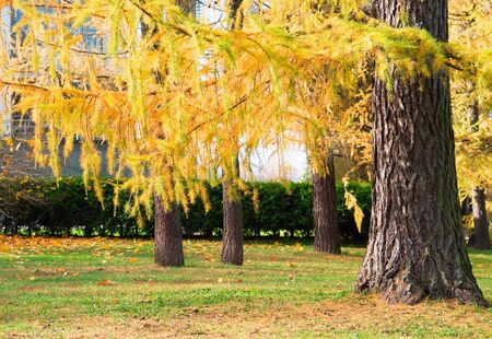 Golden autumn, bright yellow branches of larch . Saint Petersburg