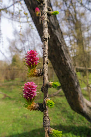 Larch tree fresh pink cones blossom at spring on nature background. Branches with young needles European larch Larix decidua with pink flowers.