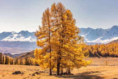 Scenic view of single tree with golden leaves standing in the field and mountains in the background. Altai mountains, Russia. Fall 2019