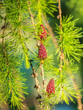 a unique and stunning view of the bright pink larch cones. Celebrate the beauty of nature in the first days of spring. Add color and vibrancy to your surroundings with flowering pine trees.