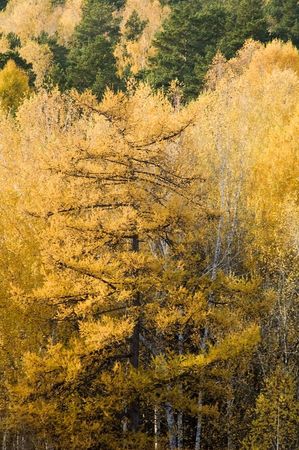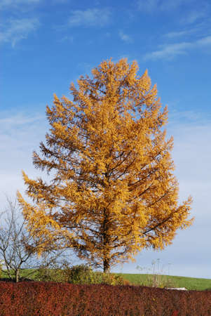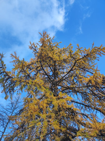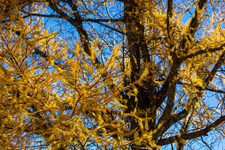 The branches of the yellow larch, which turned yellow in October, are golden yellow and orange.