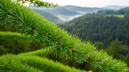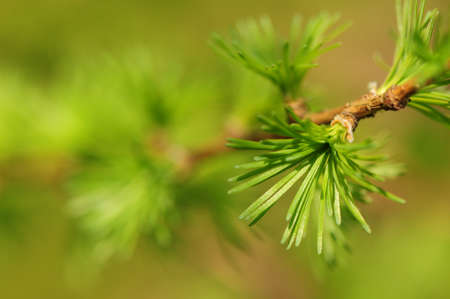 Close-up of fresh green needles on tree branch. Spring banner with copy space.