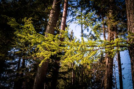 Deciduous forest in spring. Tree trunks and green young foliage in the rays of the setting sun.