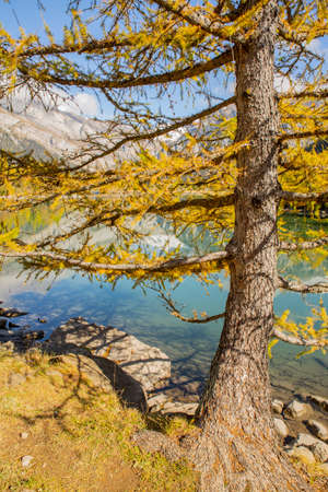 Golden larch in autumn on the lake side of Sils lake, Upper Engadine, Canton of Grisons, Switzerland.