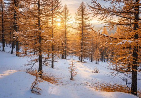 larch trees stand tall amidst the serene forest landscape, their vibrant green needles and rustic trunks blending harmoniously with the surrounding foliage, creating a picturesque scene of natural beauty, perfect for nature lovers and photography enthusiasts alike. ai generated