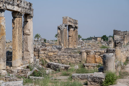 Visitors wander through the historical ruins of Pamukkale, observing ancient stone columns and the remnants of a once-great city bathed in sunlight.