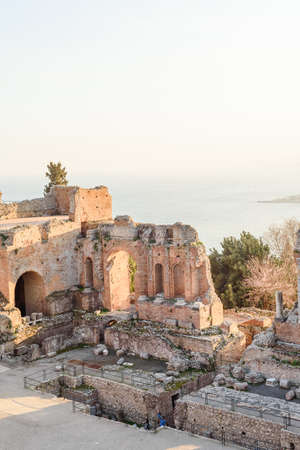 The Ruins of Taormina Theater at Sunset. Beautiful travel photo, colorful image of Sicily.
