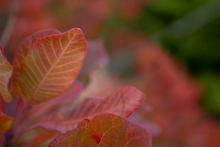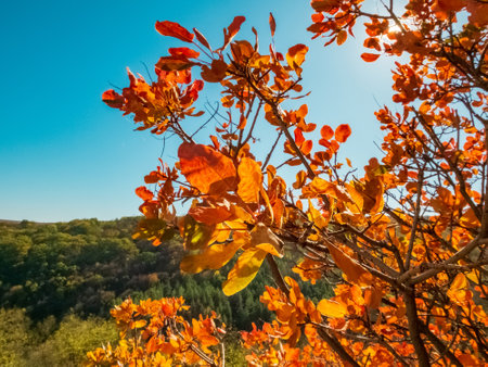 Beautiful tree with bright red and orange leaves. Brunches of wild European smoketree, Cotinus coggygria bush. Nature wallpaper with blurred bokeh lights, poster for home and office. Copy space.