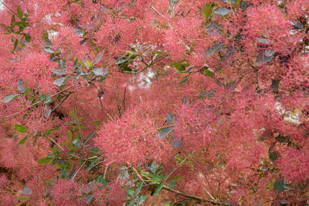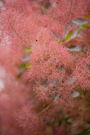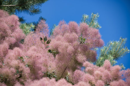 Cotinus flowers burst into vibrant pink hues, creating a magical scene on a warm spring afternoon.