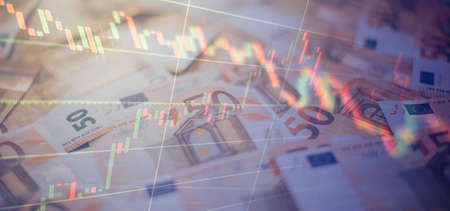 hundreds of euro banknotes on the background of a stock chart