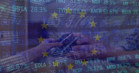 Image of stock market and flag of eu over diverse people paying with smartphone. Global finances, computing and digital interface concept digitally generated image.