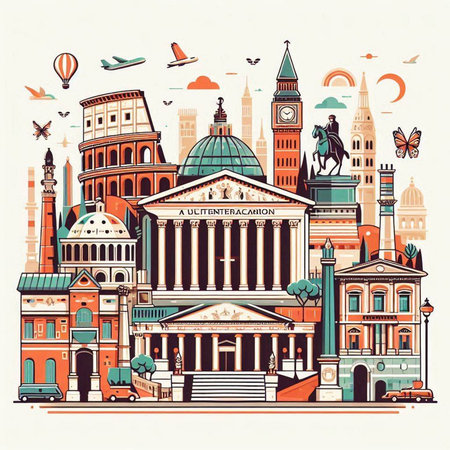 A detailed collection of iconic European architecture, including cathedrals, arches, castles, windmills, and historic buildings. Highlights diverse architectural styles, vector illustration.