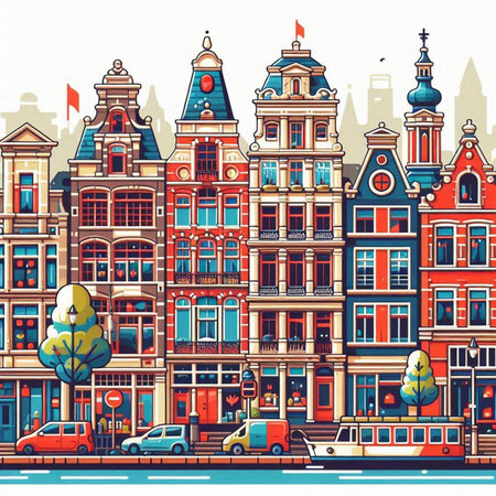 Amsterdam, Netherlands cityscape. Vector illustration in flat style.