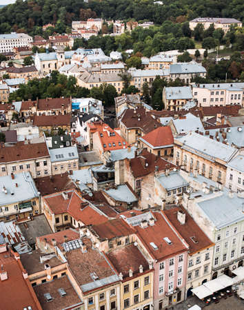 Panorama of Lviv, the view of the city with hall clock tower at sunset.