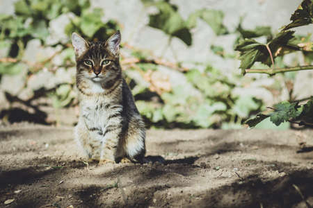 Portrait of cute cat with focus on eyes of gray orange and black colors posing at the camera on the ground on the evening time. Pet outdoor close up concept with copy space