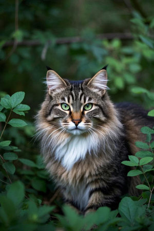 Maine Coon cat in the forest. Wildlife scene from nature.