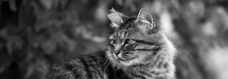 Protection of pets. Cat face close-up. A striped stray cat walks in the park. World Cat Day concept.