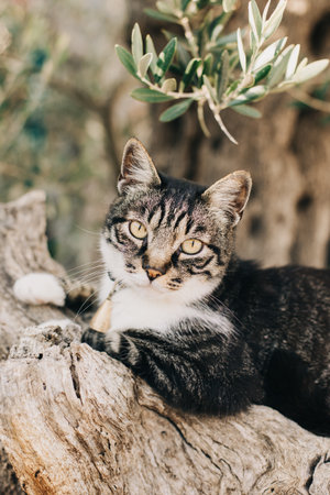 Close up cute tabby gray cat lying on a branch of old olive tree, Montenegro. Portrait of a tabby cat.