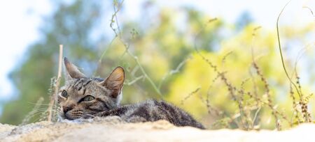 A cute happy grey tabby kitten lies and rests on the floor of the park in the rays of sunlight, looks at the camera, wiggles its ears and enjoys the morning sun.