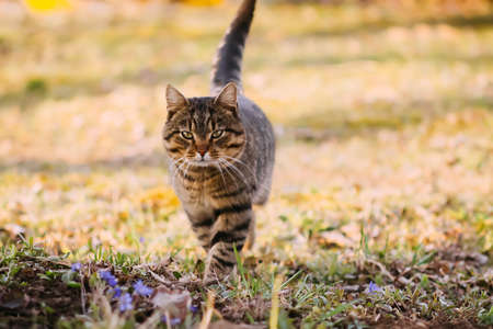 Spring March tabby cat is going or walking on dry leaves. Life on the nature.