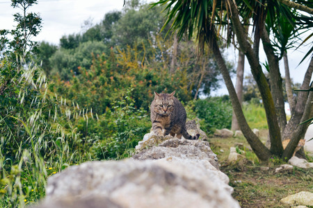 Tabby cat walking over stone wall in garden. Majorca. Balearic island. Spain.