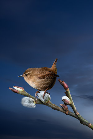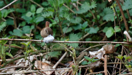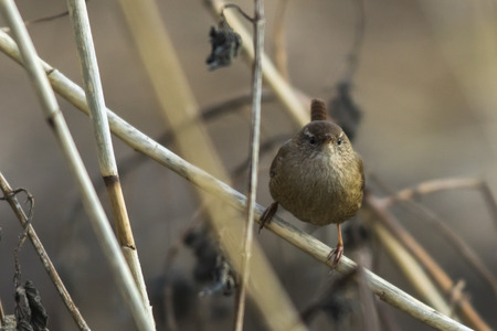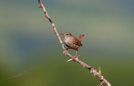 The Eurasian wren (Troglodytes troglodytes) or northern wren perching on twig.