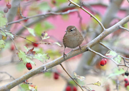 The Eurasian wren (Troglodytes troglodytes) filmed on branches of a hawthorn bush with red berries