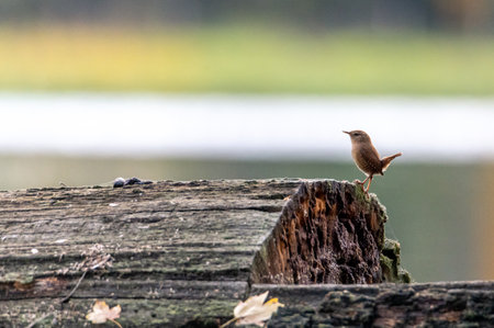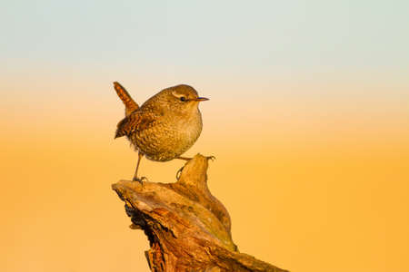 Wren or Winter Wren (Troglodytes troglodytes) perching on an old stump