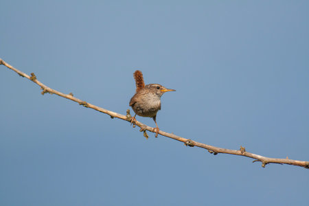 Wild bird wren, troglodytes troglodytes, perched on a tree branch singing