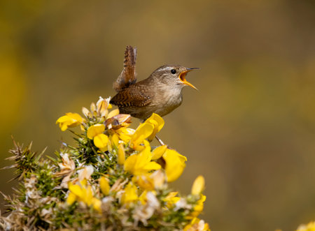 Wren, Troglodytes troglodytes, single bird on gorse, North Wales, April 2023