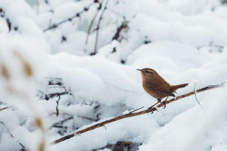 Brown small eurasian wren (Troglodytes troglodytes) sitting on the tree branch on winter nature background