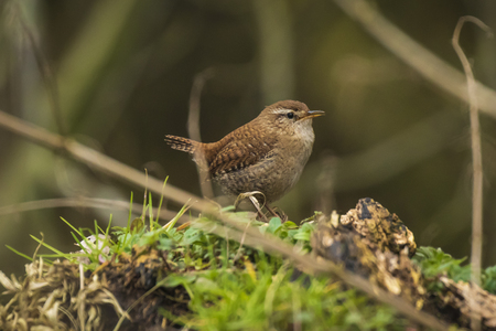 Eurasian wren (Troglodytes) sitting on a small stick.