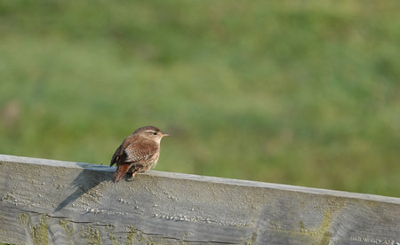 Wild wren set on metal post with green background (Troglodytes troglodytes)